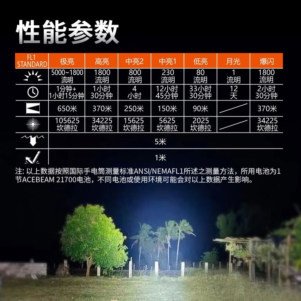 月光:1流明;12天 低:80 流明;2025年CD;90米;33 時 30 分 Mid1:230流明;5625cd;150米;12 時 45 分 Mid2:800流明;15625cd;250米;4小時 高:1800流明;34225光碟;370米;1小時30分鐘 渦輪增壓:5000~1800流明;105625cd;650米;1 分鐘 + 1 小時 15 分鐘 頻閃:1800流明;34225光碟;370米;2 小時 30 分鐘 最大輸出 5000 流明 最大光束距離:650米 最長運行時間:12 天 峰值光束強度:105625cd 規格: 尺寸:(長度)152 mm x (頭部直徑) 54.2 mm x (管直徑) 25.4 mm 重量:250 克(8.8 盎司),含電池