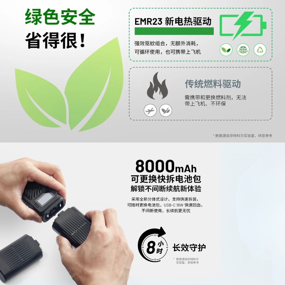 奈特科爾EMR23二合一戶外隨身驅蚊器,180°C電熱驅蚊,10分鐘速成驅蚊保護區,採用全新分體式8000mAh電池包設計,支援快速拆裝換電,也可用於應急供電。