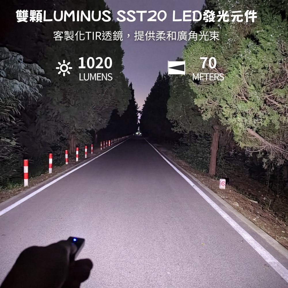 - 最高輸出1020流明,照射距離達70公尺