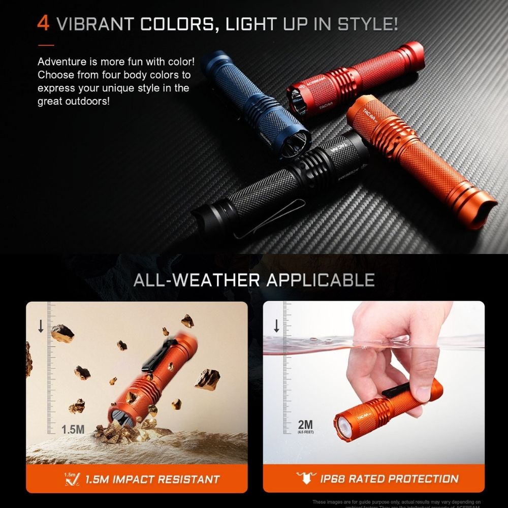 TAC AA 2.0 是一款緊湊型 EDC 手電筒,不比指尖大,採用極簡主義戰術風格設計,方便攜帶。它提供兩種 LED 選項:紅/藍版本配備 SFT-25R LED,提供長達 360 公尺的光束距離;而黑色版本則是高亮度型號,最大輸出為1000流明。它與標準 AA 電池相容,易於購買和更換。尾蓋設計支援倒車操作,並加入白色或橙色擴散器,還可以作為閱讀燈、信號燈或應急燈。此外,防水深度達 2 米,抗衝擊深度達 1.5 米,適合各種環境。