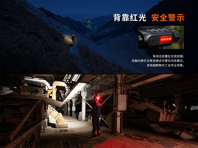- 電池盒具有獨立紅光、紅閃功能,提供全視角保護,保障夜間運動安全