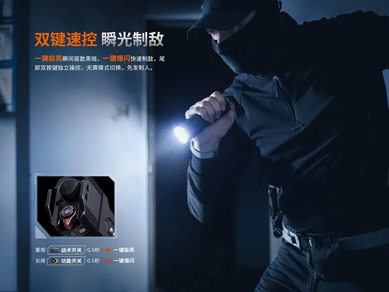 尾部採用靜音戰術雙開關,具備一鍵爆閃、一鍵極亮功能