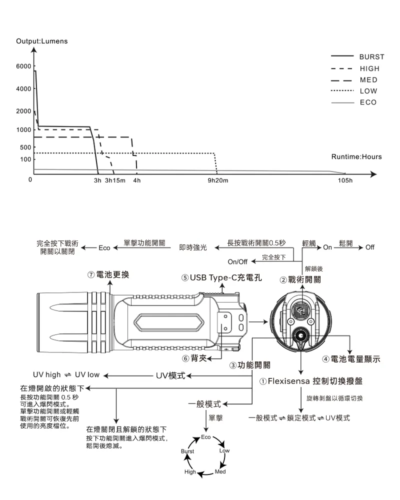 ◎靈感撥盤設計允許無縫切換多種模式,包括白光模式、鎖定模式及UV模式