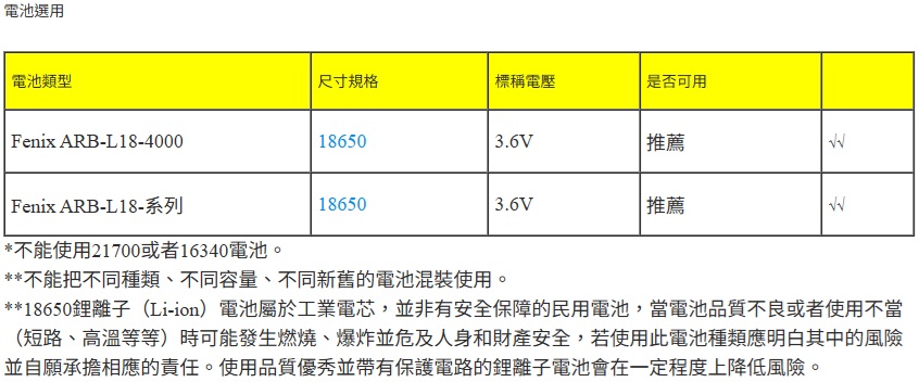 ◎標配2節可充電的Fenix ARB-L18-4000 鋰離子電池