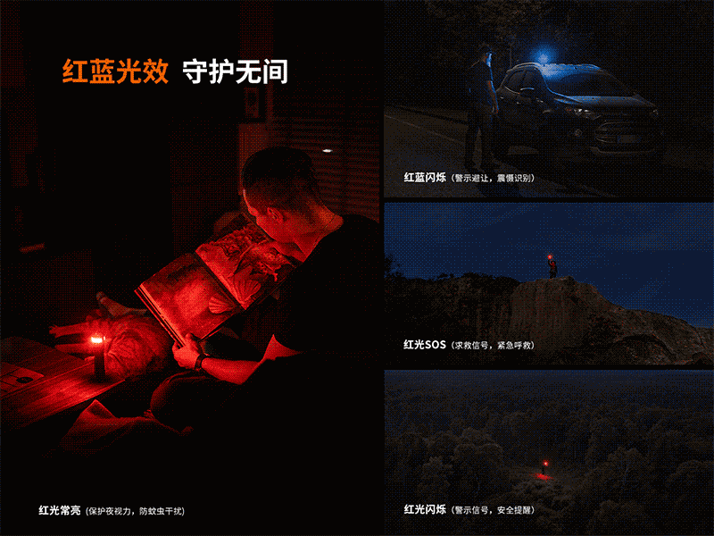 白光/紅光/藍光三光源設計,滿足不同場景的照明需求