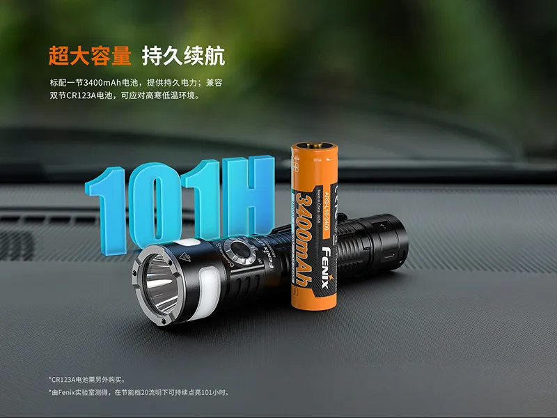 ◎標配1節3400mAh電池,相容2節CR123A電池
