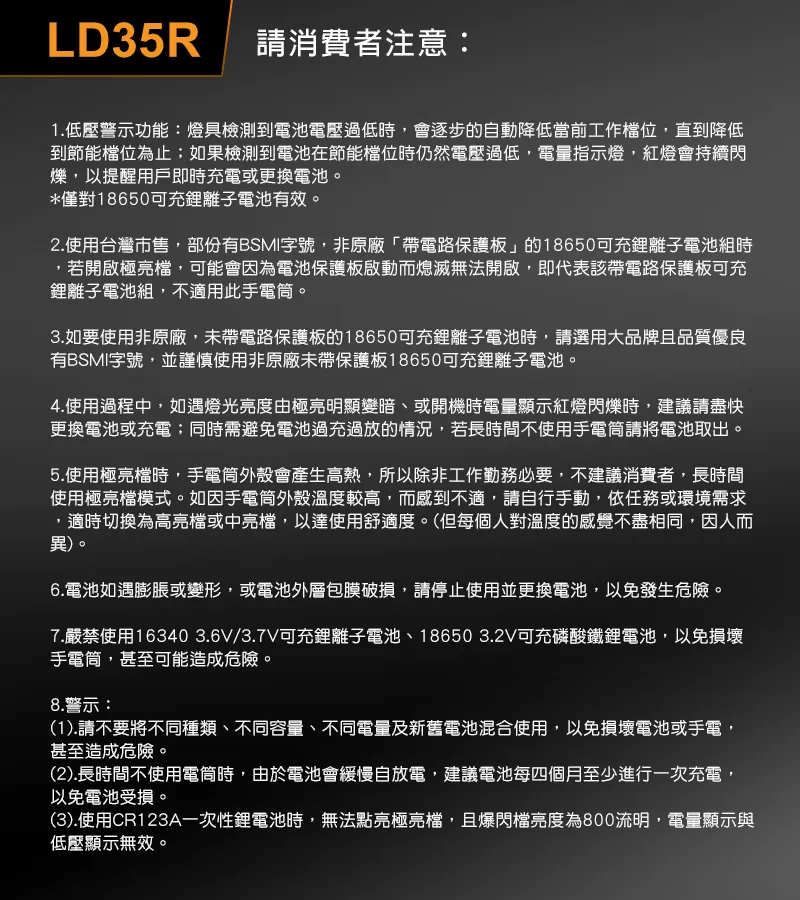 LD35R手電筒、ARB-L18-3400鋰離子電池、Type-C 充電線、布套、手繩、備用防水圈、說明書、保修卡
