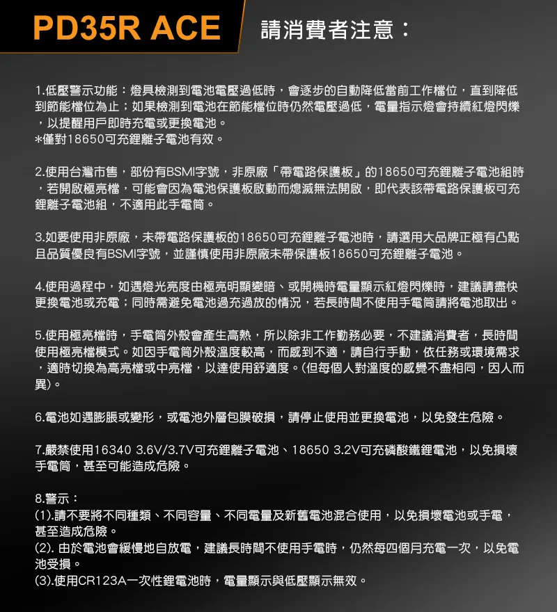 PD35R ACE手電筒、ARB-L18-4000電池、Type-C 充電線、布套、手繩、備用防水圈、說明書、保修卡