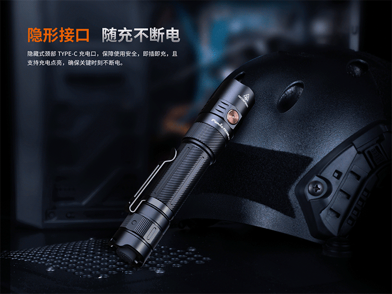 手電筒頸部設有隱藏式Type-C充電介面,即插即充,方便快捷