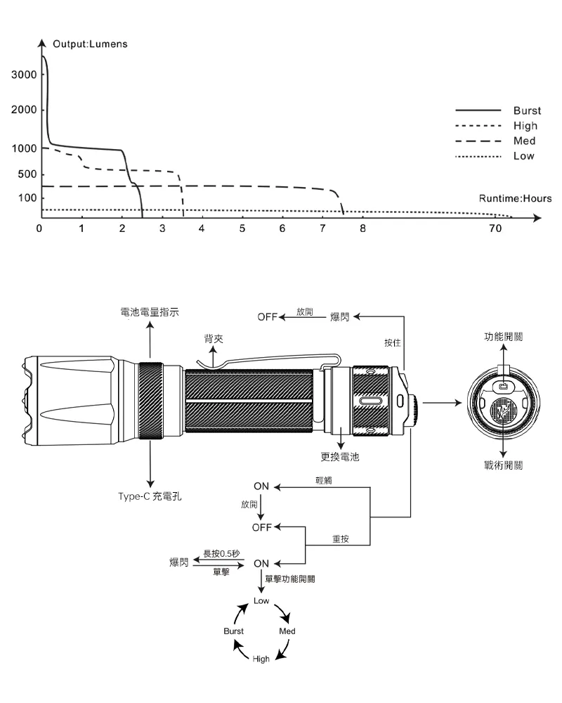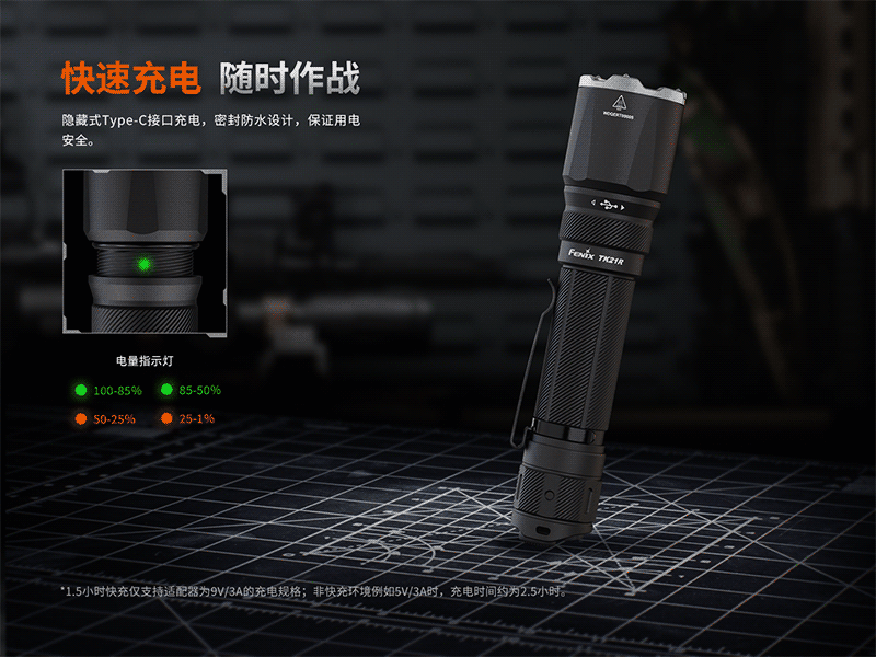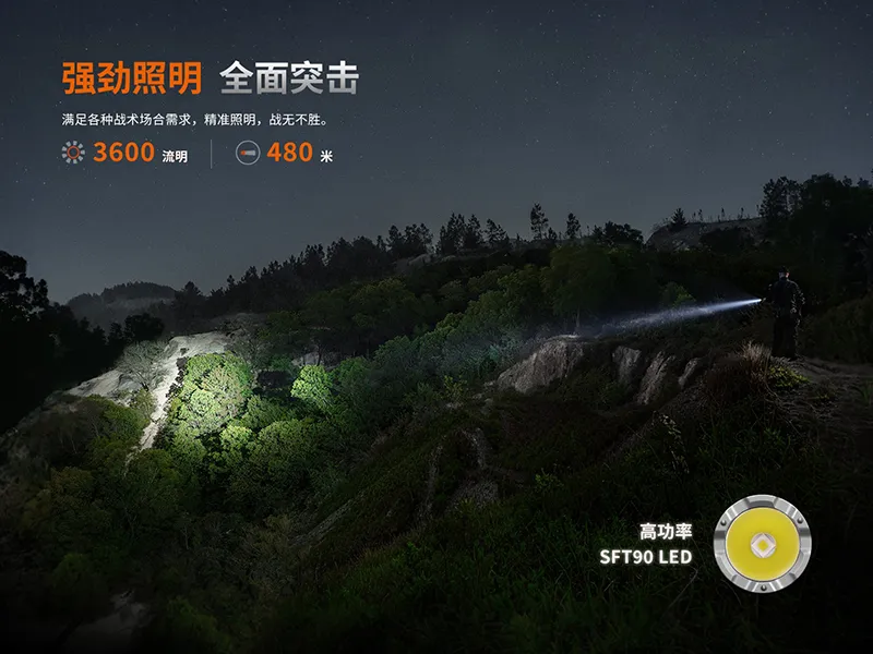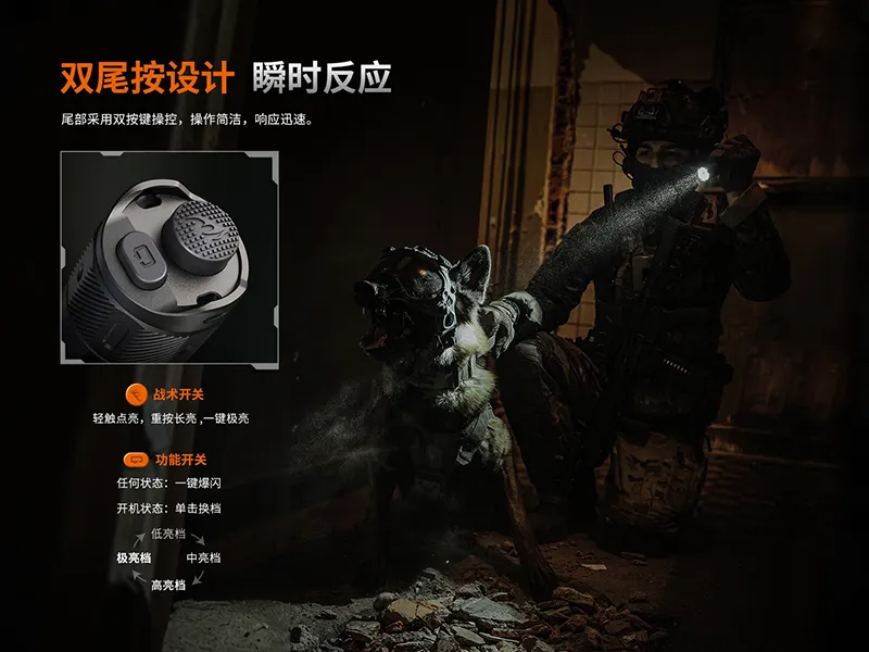 ◎戰術雙尾按控制,快速實現一觸即亮和一鍵爆閃