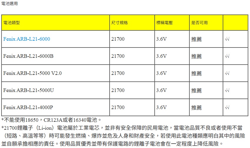 ◎標配1節Fenix ARB-L21-6000可充電鋰離子電池