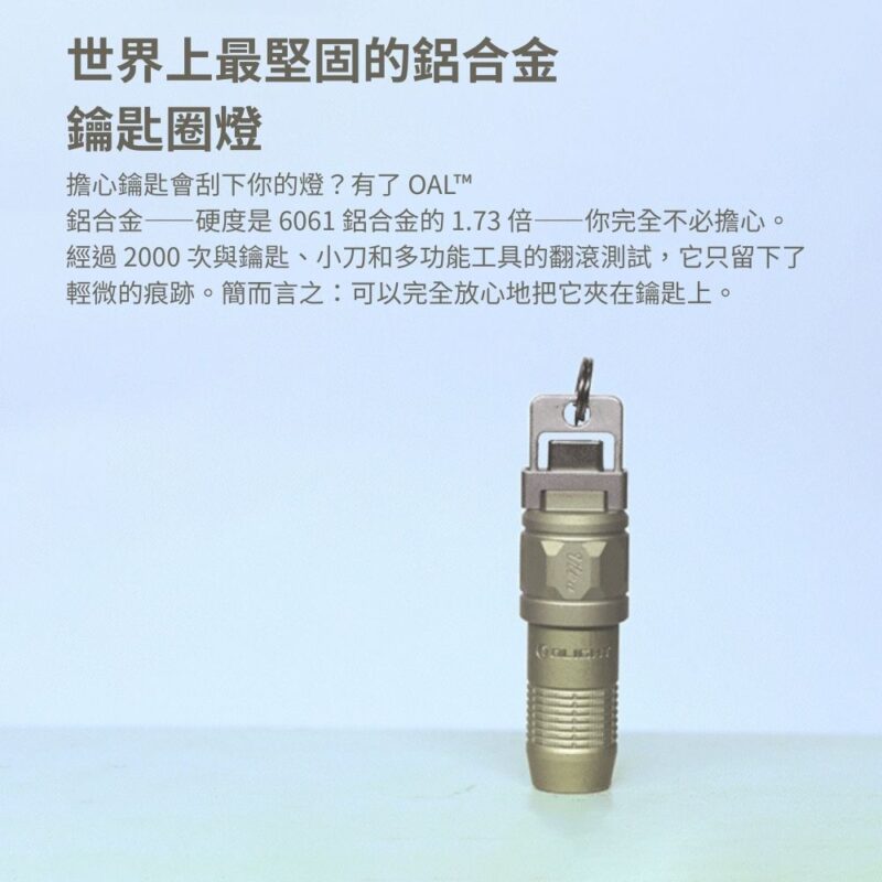 .最堅韌的鋁製鑰匙圈燈:採用Olight的OAL™鋁製成,硬度是6061的1.73倍,燈具硬度為極為耐用且防刮,同時提供高級質感與抓握感。帶著鑰匙或硬幣自信地攜帶,知道它能輕鬆應付日常的顛簸、跌落和刮痕。