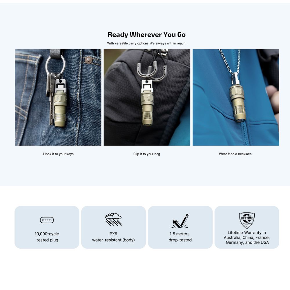 設計上,你可以直接在鑰匙圈上充電,無需取下它,讓供電更方便。磁基座讓你能把它黏在金屬表面上,實現免手照明。iUltra 體積小巧、耐用且攜帶輕鬆,剛好戴上您的鑰匙圈、背包或項鍊——隨時準備提供即時且可靠的照明。