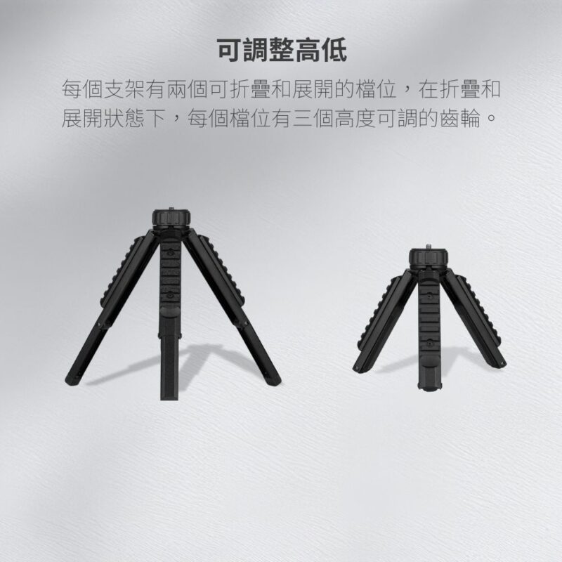 無限可能,個人化DIY戰術配件,主體採用鋁合金設計,每個腳位均配備尼龍皮卡汀尼導軌,頂部配有1/4吋螺母。