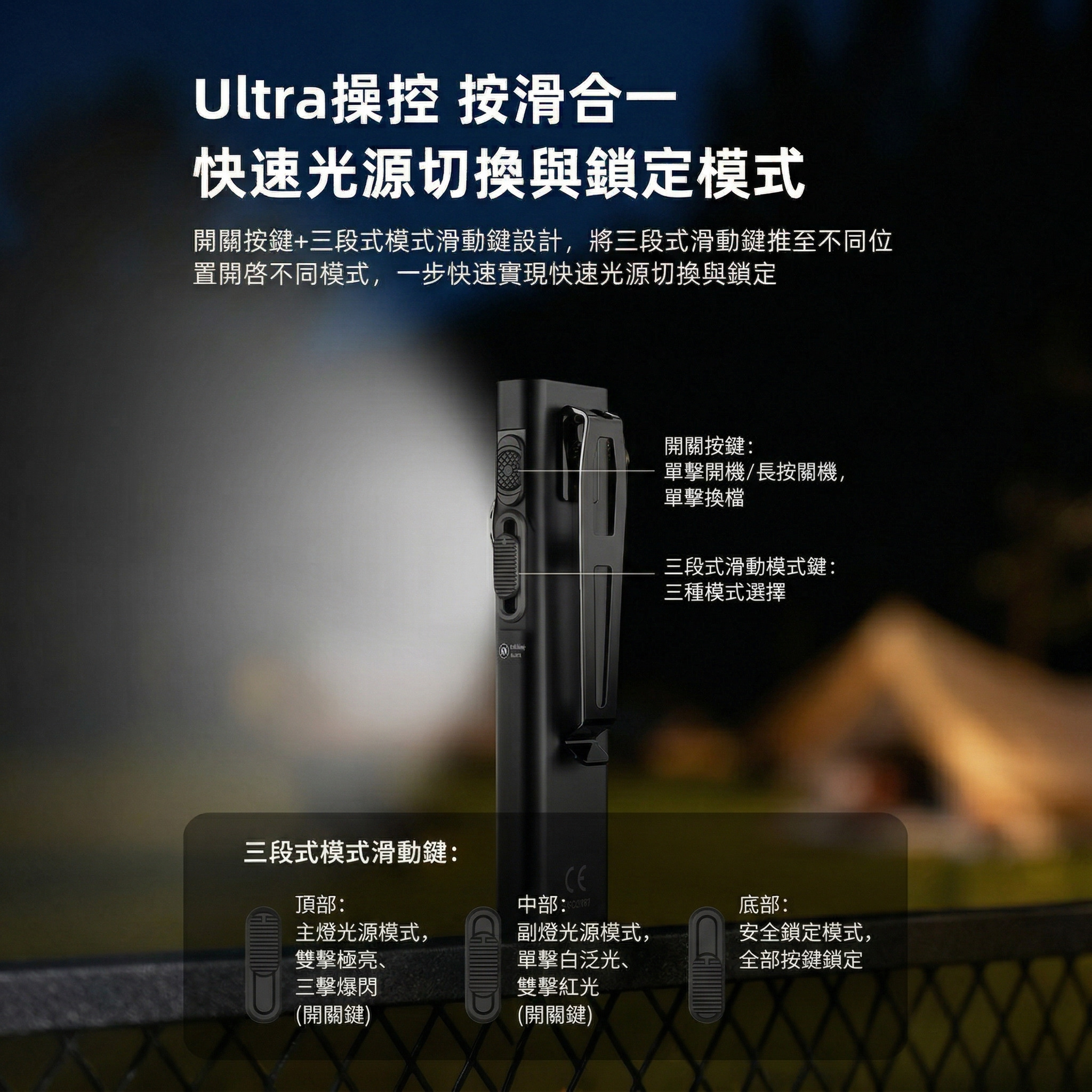 - 開關鍵+三段式滑動模式鍵,按滑合一設計