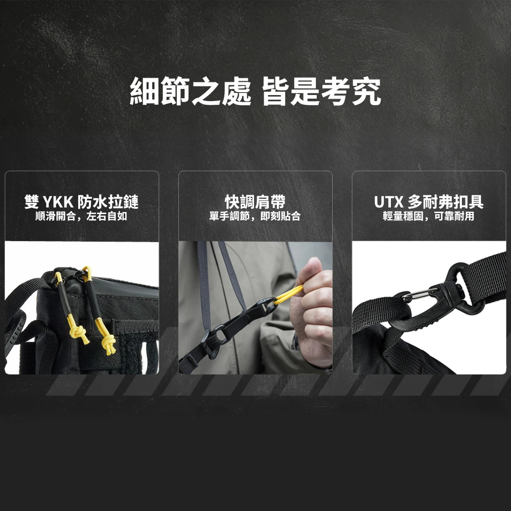 - 採用 YKK 拉鍊與 UTX Duraflex 扣具,耐用可靠