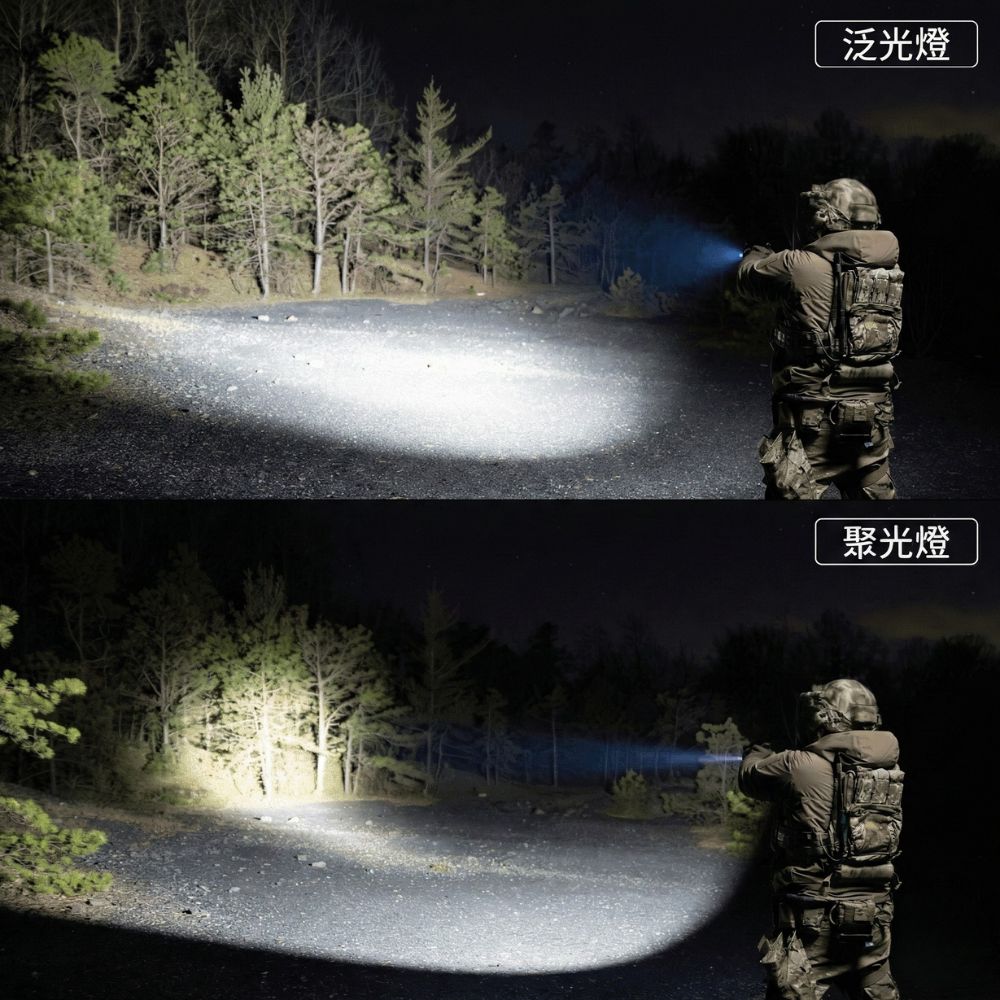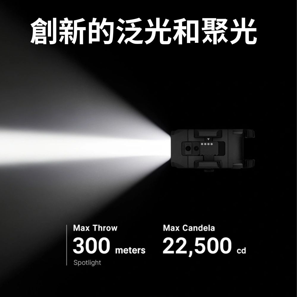 - 創新泛光/聚光雙光源設計: 可在兩種獨立光束間無縫切換。提供最高 1,200 流明的廣角泛光,適合大範圍近距離照明;或 22,500 坎德拉高強度聚光,最遠照射距離可達 300 公尺,精準鎖定遠距目標。
