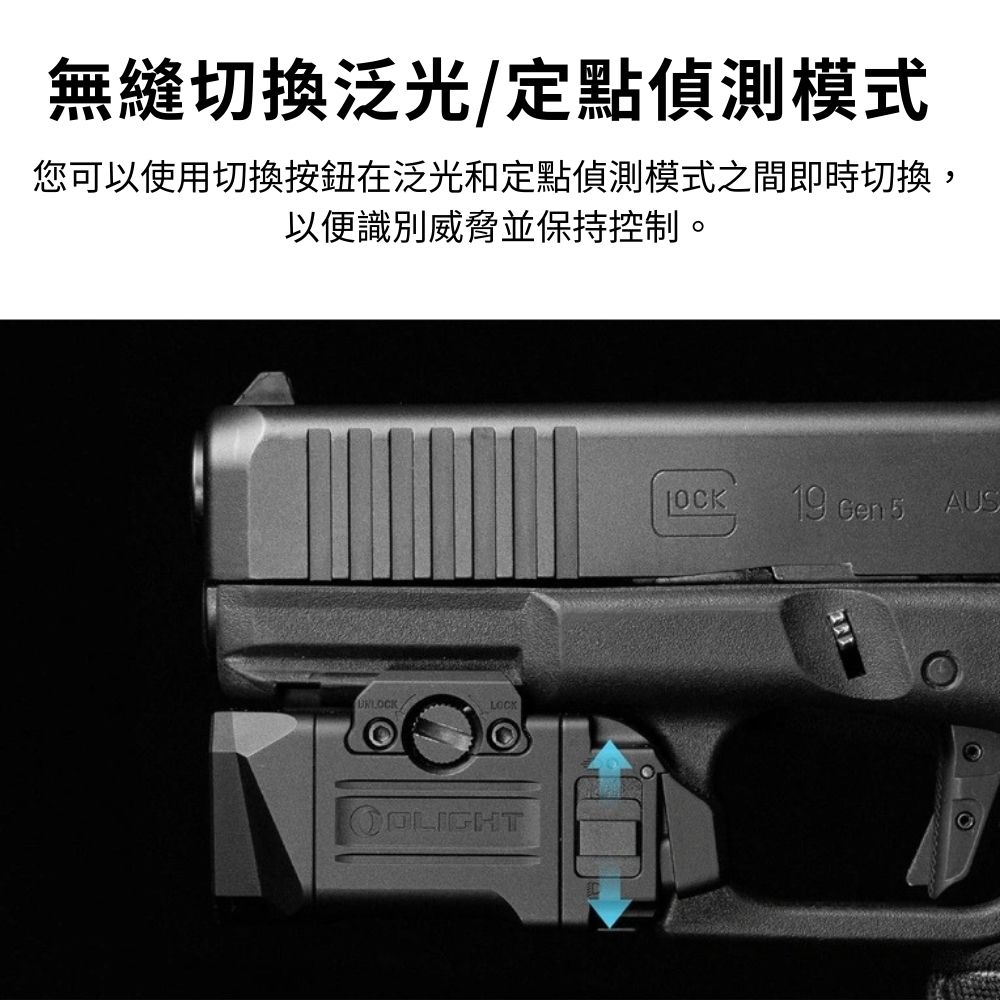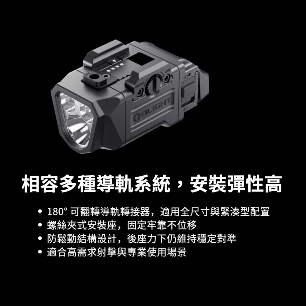 - 高相容性導軌安裝系統: 採用專利防鬆脫棘輪式固定結構,可穩固安裝於多種槍枝導軌,安裝後不晃動、不位移,確保在關鍵時刻光源始終保持在正確位置,兼顧相容性與可靠性。
