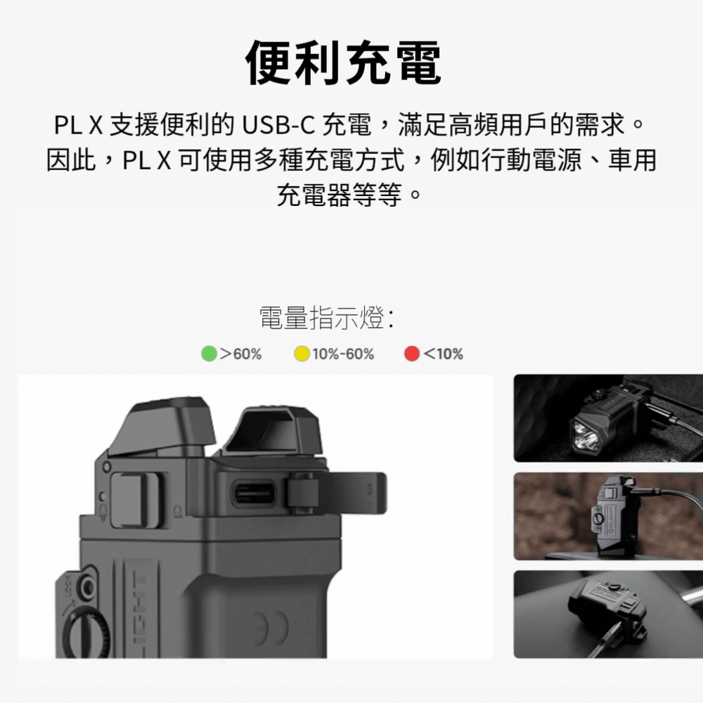 內建 USB-C 充電埠,可透過車用電源、行動電源或一般 USB-C 充電器快速充電,無論在勤務現場或日常使用中,皆能隨時保持待命狀態。
