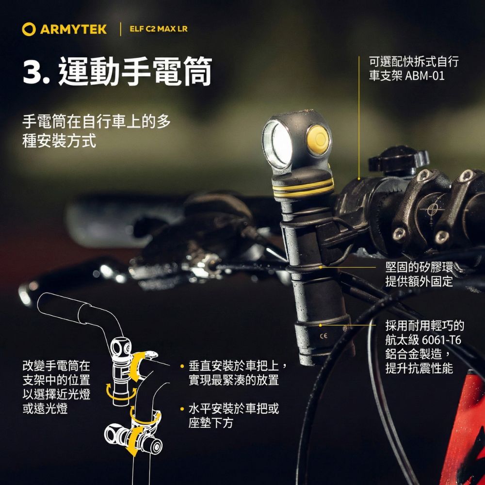 - 最大光輸出:寬 LED 搭配特殊反射器,提供極致亮度與距離