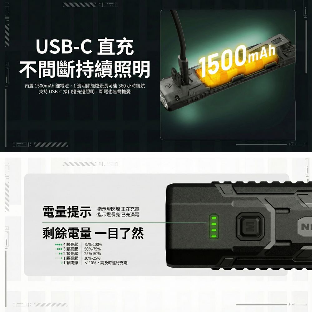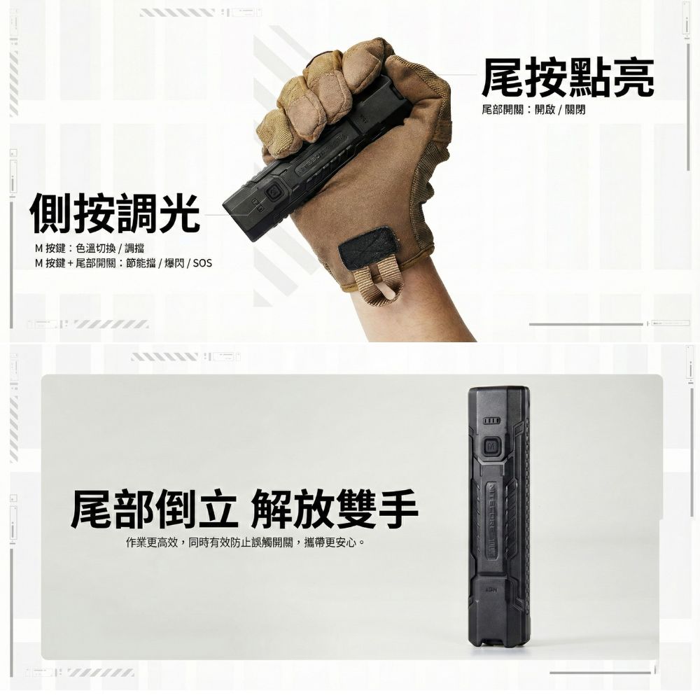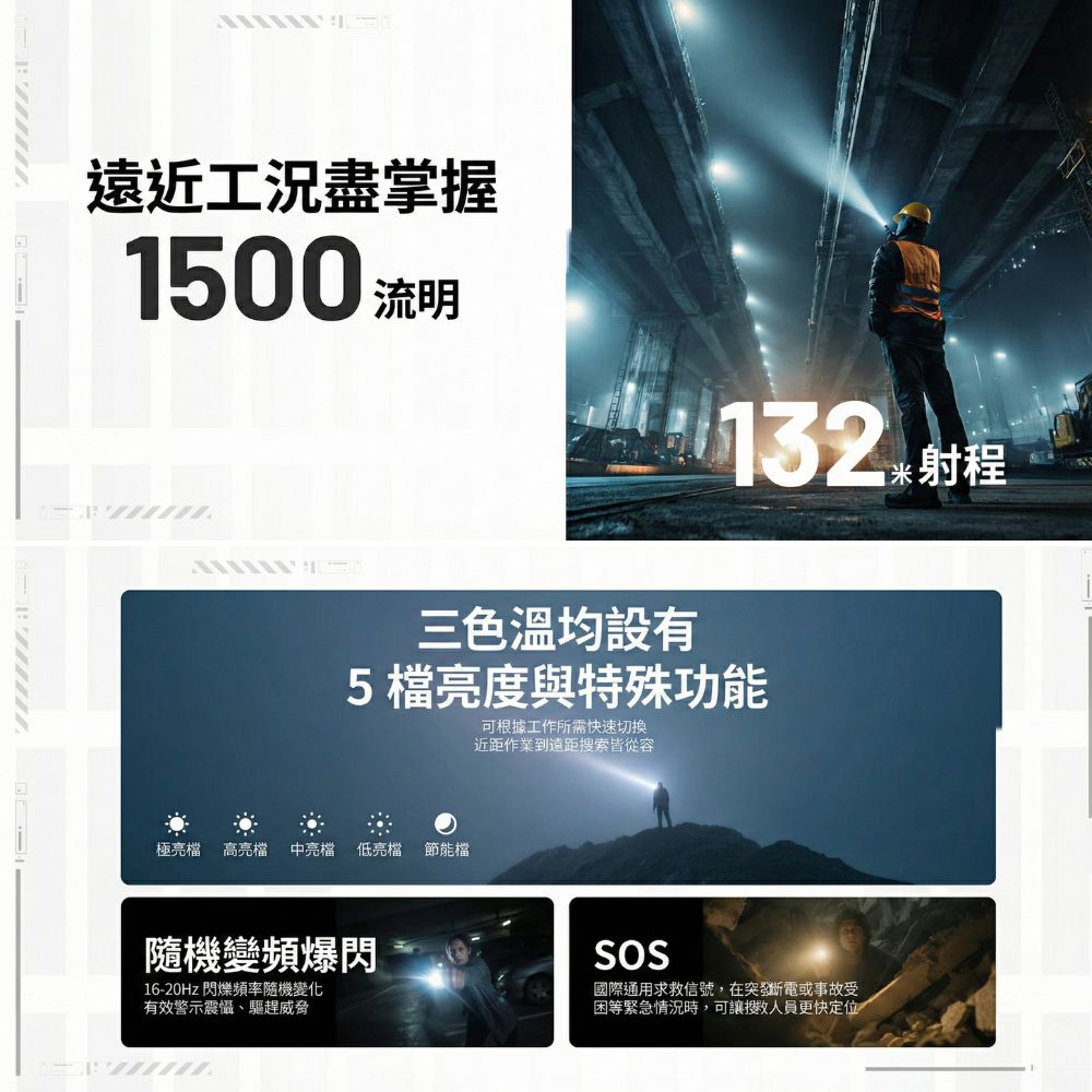 - 特殊模式: 支援一鍵爆閃、SOS 求救信號及超低亮模式。