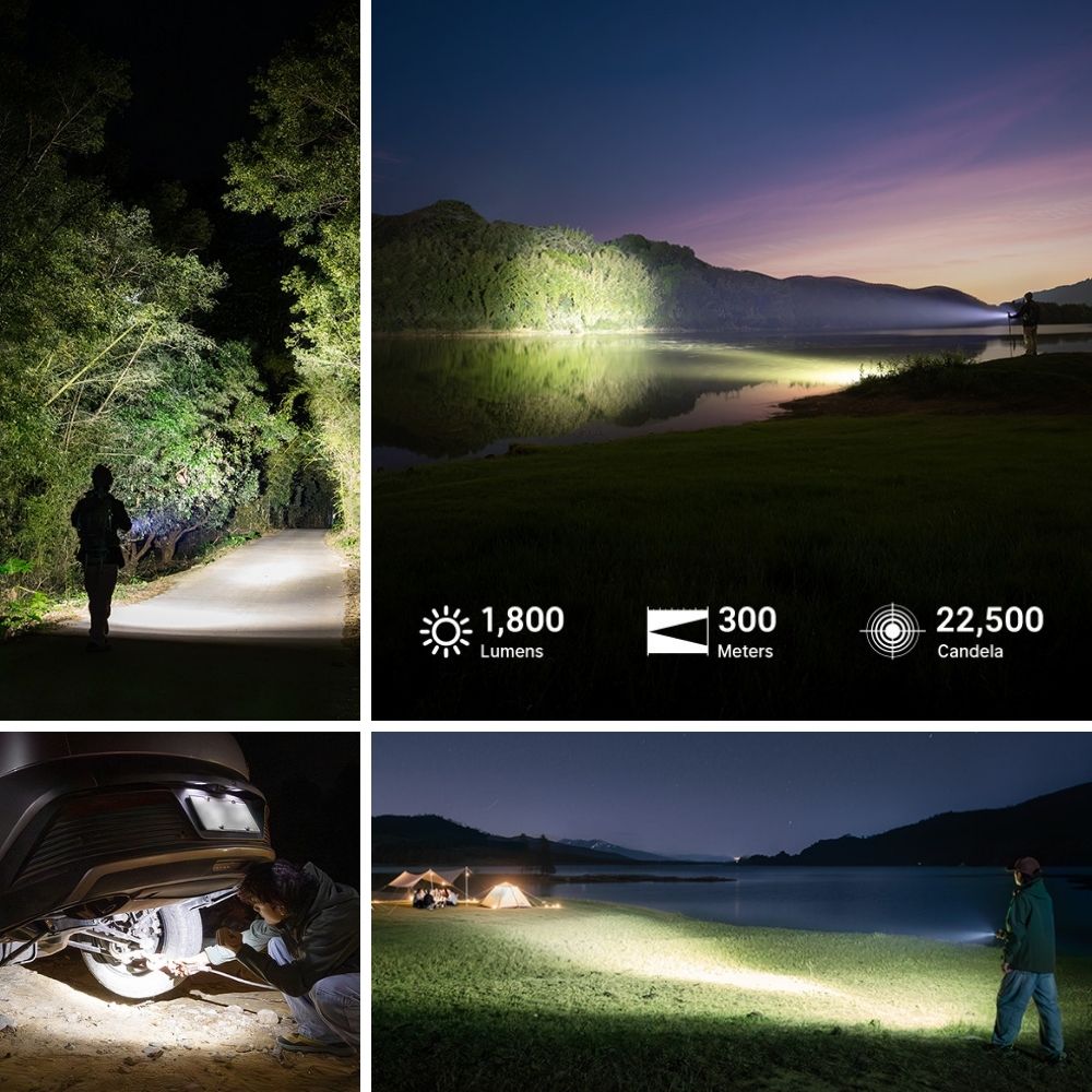 - 超遠射程: 光束射程高達 300 米,亮度達 1,800 流明,為戶外探索提供強大的長程視野。
