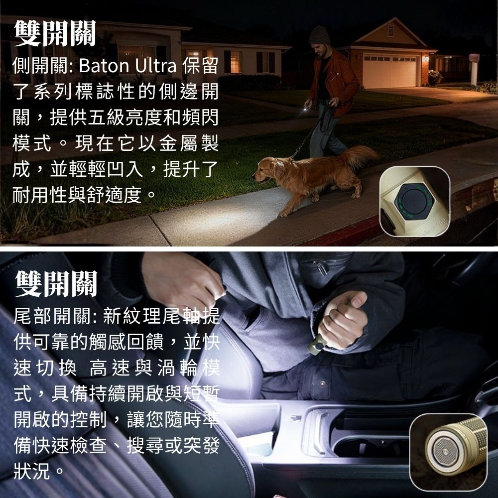 Baton 4 Pro 與 Baton Ultra 結合了小巧易攜的設計與令人驚豔的照明性能,是專為日常探索所打造的完美工具。這兩款手電筒提供卓越的亮度與射程,無論是日常攜帶 (EDC)、居家使用、工作需求、緊急照明,或是健行、露營與夜間散步等戶外活動,都能成為您最可靠的夥伴。 採用專利非均勻電極 LED 設計,高功率下發光效率領先同級約 10%,提供清晰自然的純白光束。 精心設計的雙開關介面讓操作更直覺,搭配全新防滑紋理與「磁吸+Type-C」雙重充電功能。內建 3500mAh 大容量電池,提供您日常與長途探險所需的穩定超長續航力。
