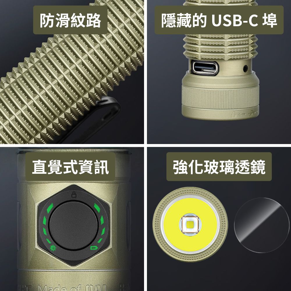 - 狀態一目了然: 具備雷射微孔技術的亮度與電量指示燈,新增鎖定圖示,隨時掌握手電筒狀態。