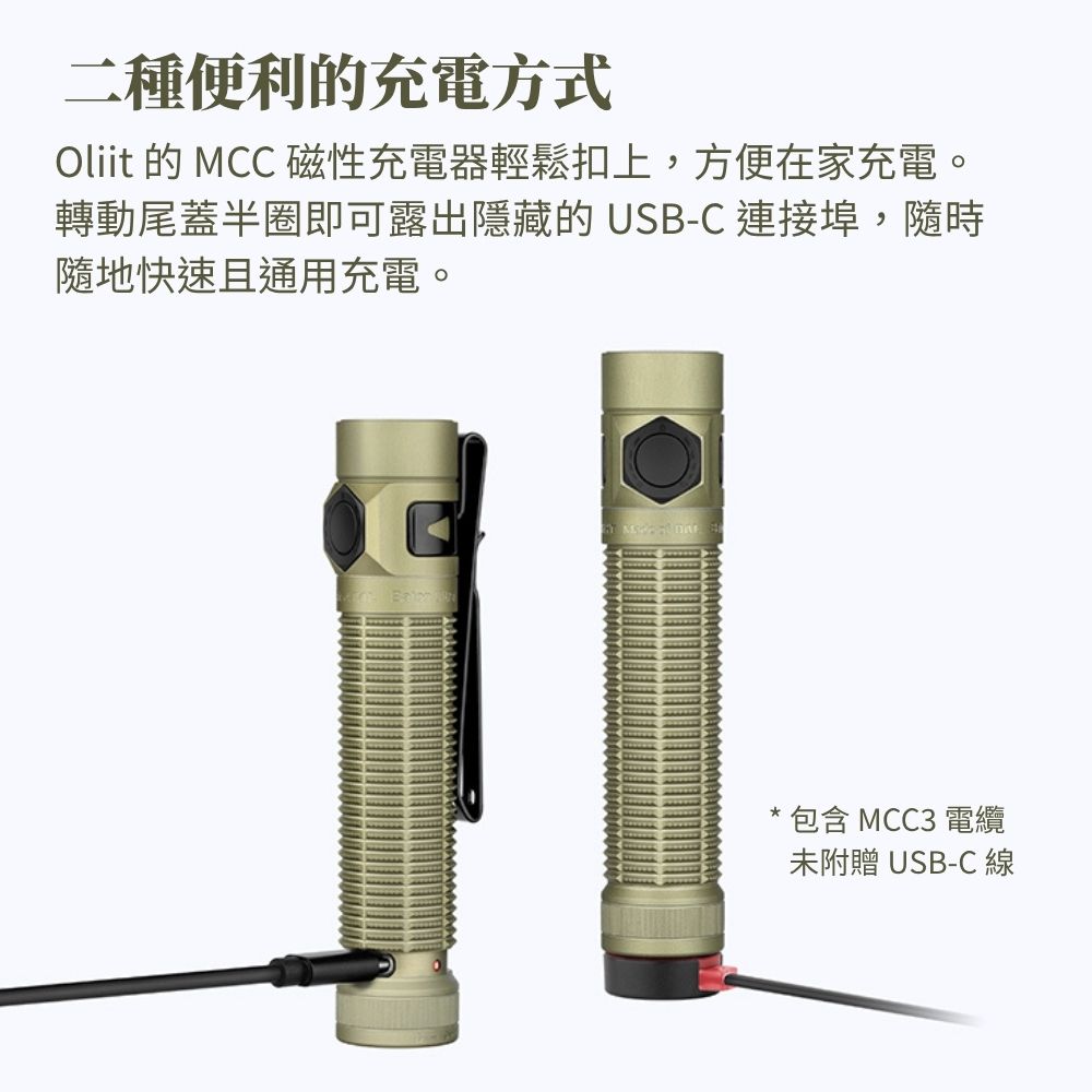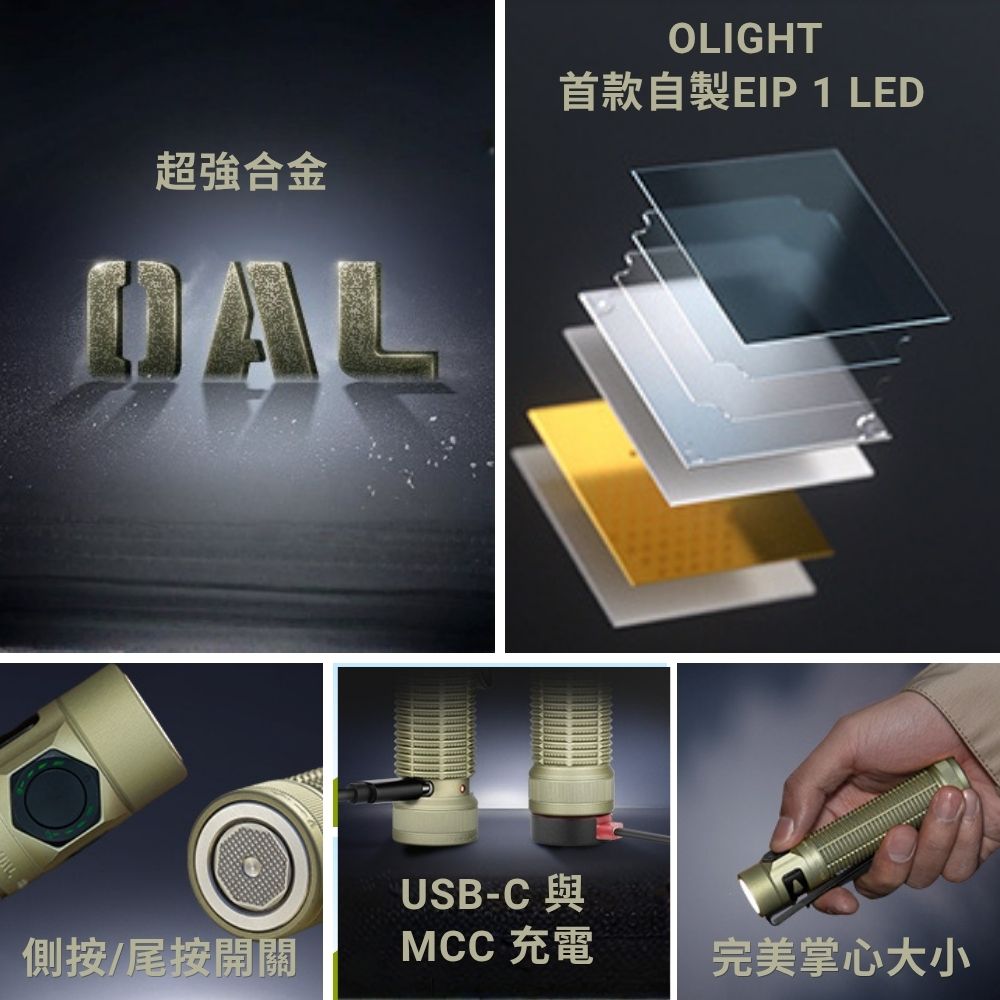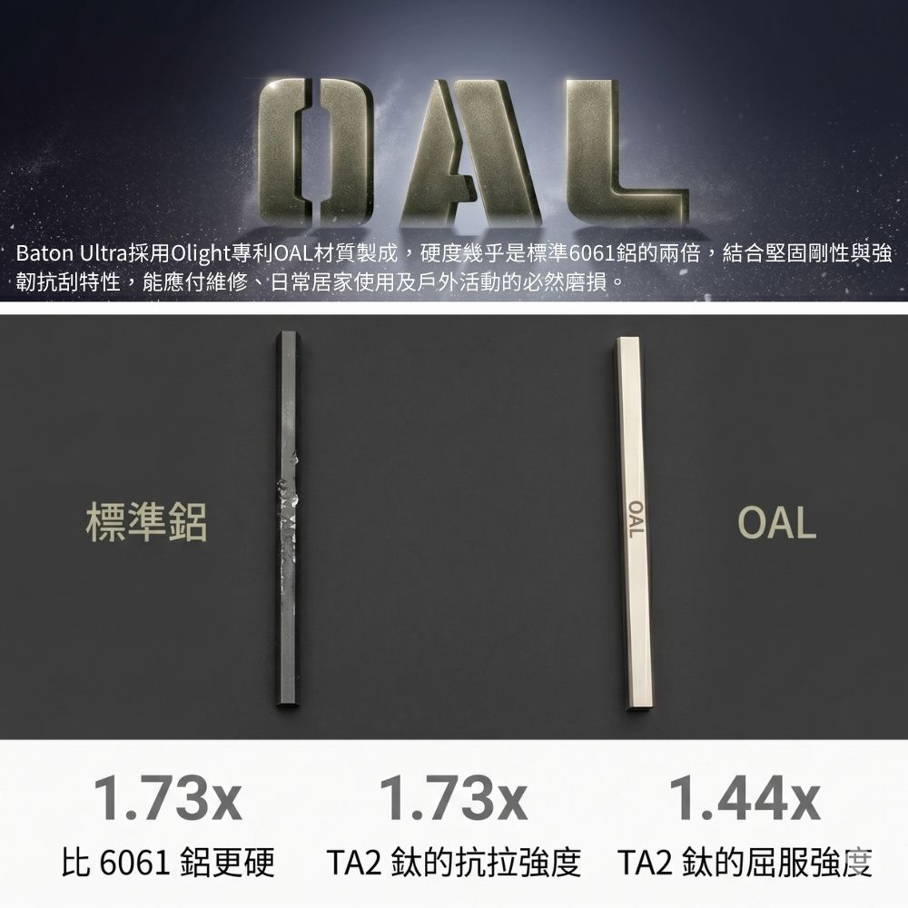 - 獨家超合金 OAL 材質: 機身採用 Olight 專利 O-aluminum 鋁合金打造,抗刮耐磨,輕鬆應對各種嚴苛環境。