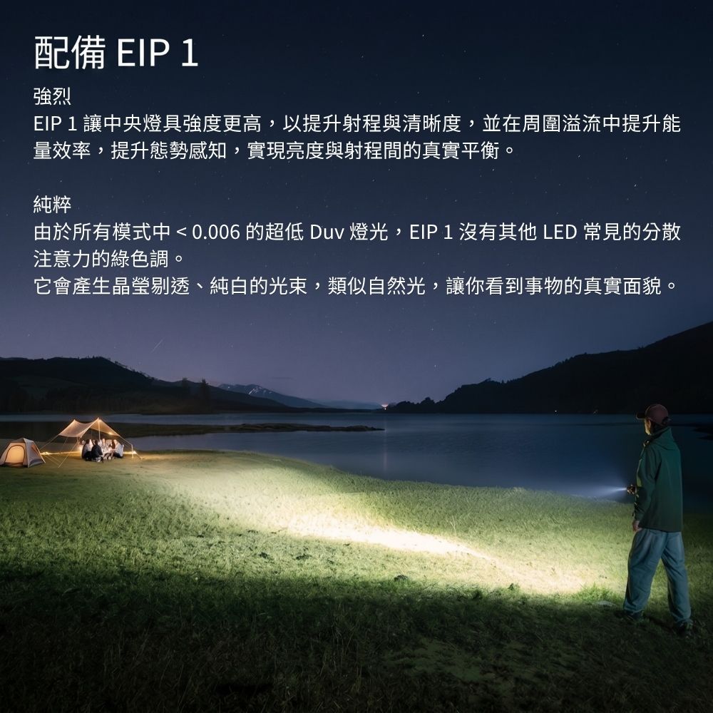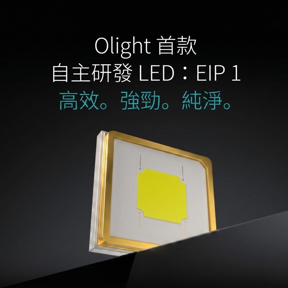 - Olight 自主研發 EIP 1 LED: 採用專利非均勻電極 LED 設計,高功率下發光效率領先同級約 10%,提供清晰自然的純白光束。