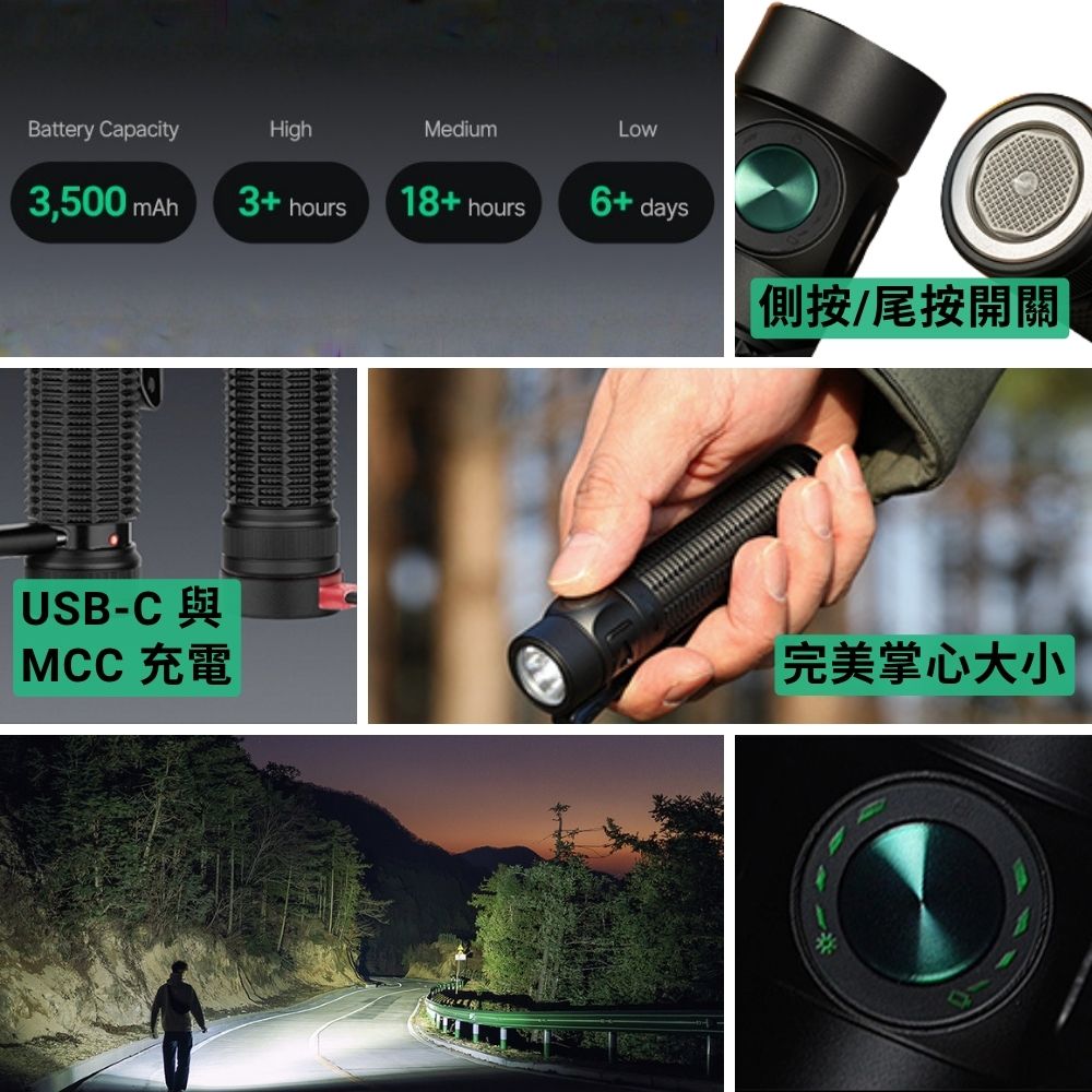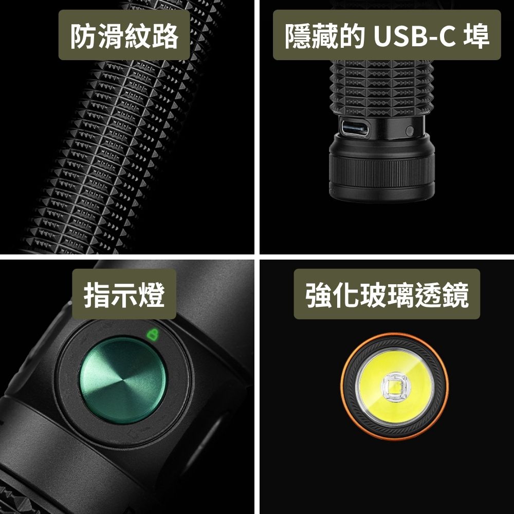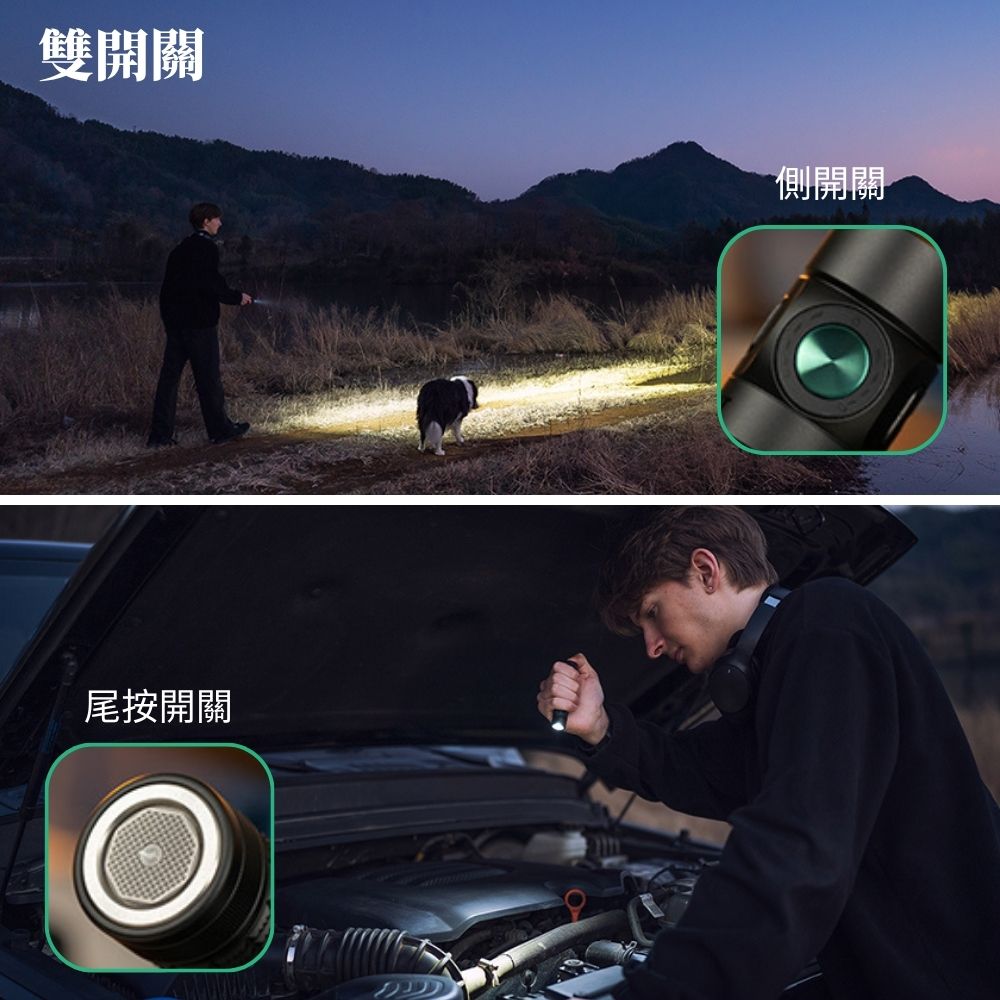 - 雙開關即時控制: 側按鍵可切換五種日常亮度;全新紋理的尾部按鍵可一鍵直達高亮與極亮模式,並支援戰術點亮,應對突發狀況。