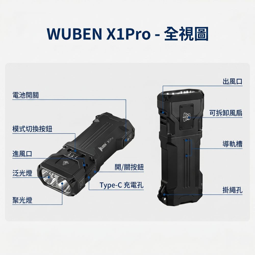 WUBEN X1 PRO 12300流明 410米 高亮度聚泛光EDC手電筒 智能散熱風扇 長續航 戶外探險 可更換21700
