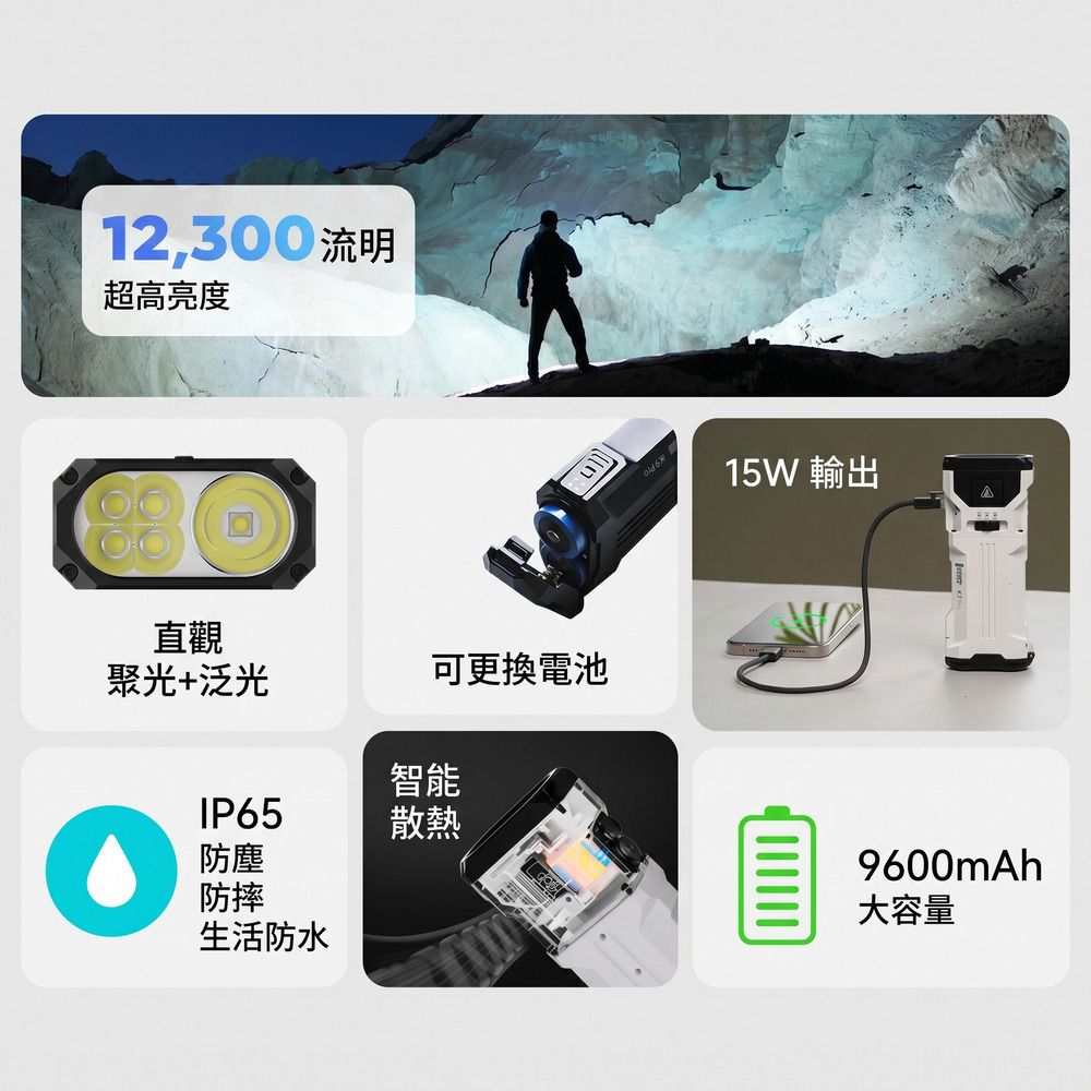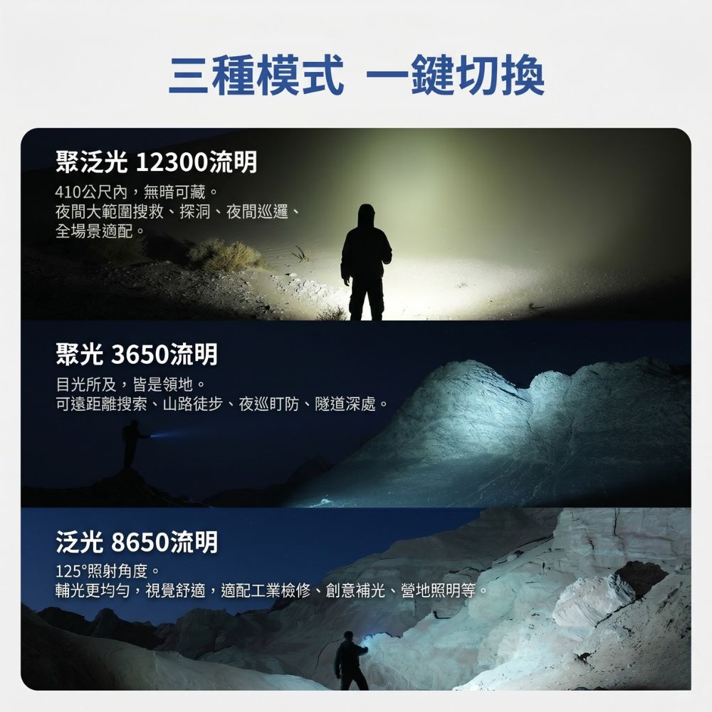 ◎超高亮度輸出(12,300流明)-真正的高流明手電筒,為森林、洞穴和峽谷探險提供極致亮度。