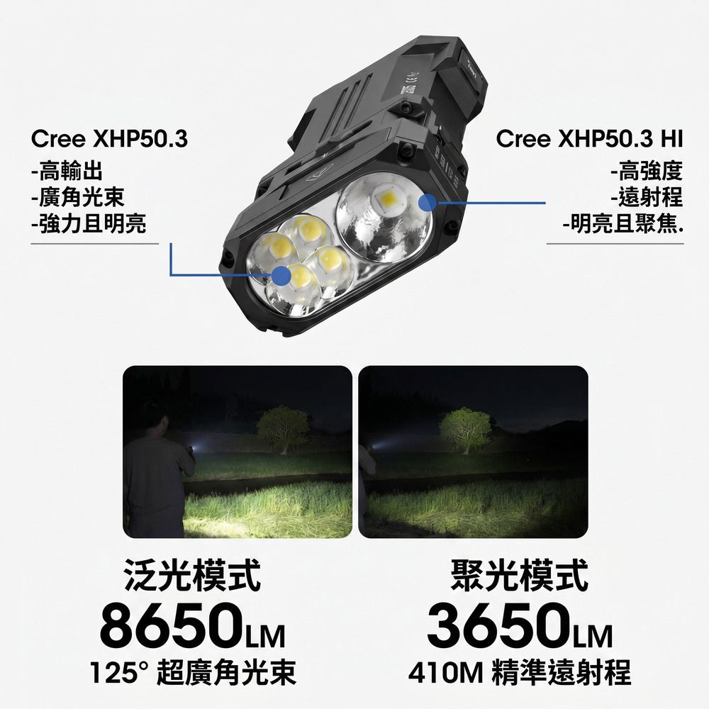 ◎可切換泛光和遠射光束-配備CREE XHP50.3 HI LED。輕鬆切換泛光和遠射光束,適應不同場景。用途廣泛,可充電手電筒。