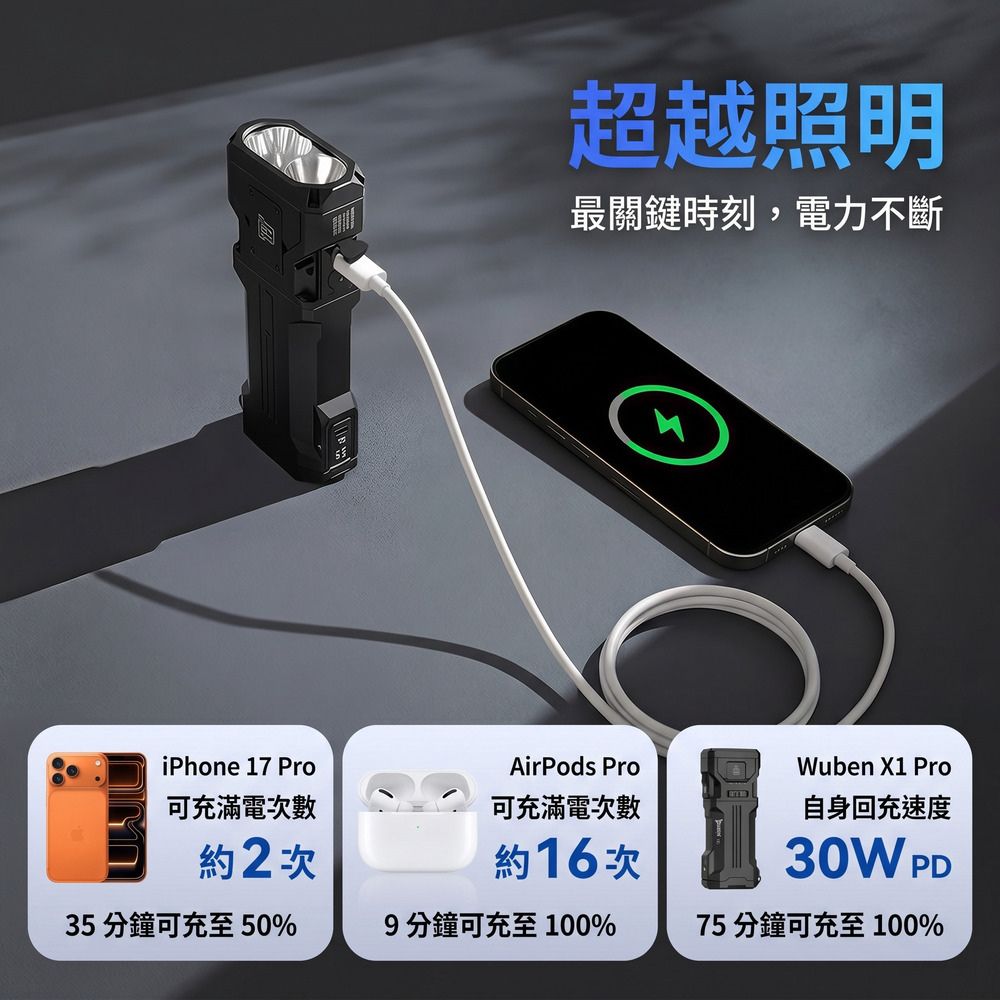 Wuben X1Pro 是一款專為探索者設計的輕巧、扁平且創新的 EDC 手電筒。它能提供高達 12,300 流明的極致亮度,不僅能為戶外探險照亮未知的道路,還能作為高容量的行動電源,為您的其他設備充電。