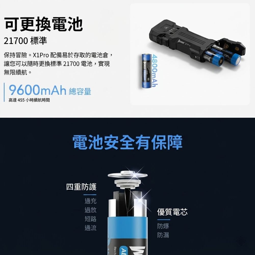 •電池安全: 具備防爆、防漏液設計,並提供防過充、防過放、防短路與防過流等四重安全保護。